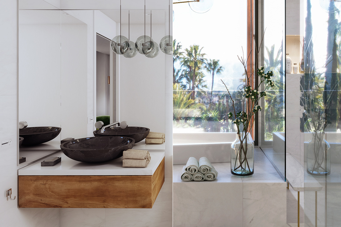 Being the bathroom the space of maximum intimacy, in Le Blanc we wanted to transform it into a room with elements of comfort. In addition to the breathtaking view of Marbella in a whirlpool bathtub overlooking the sea and a sink whose mirror reflects this incredible place, the luxury of this bathroom is elevated to a whole new dimension.
